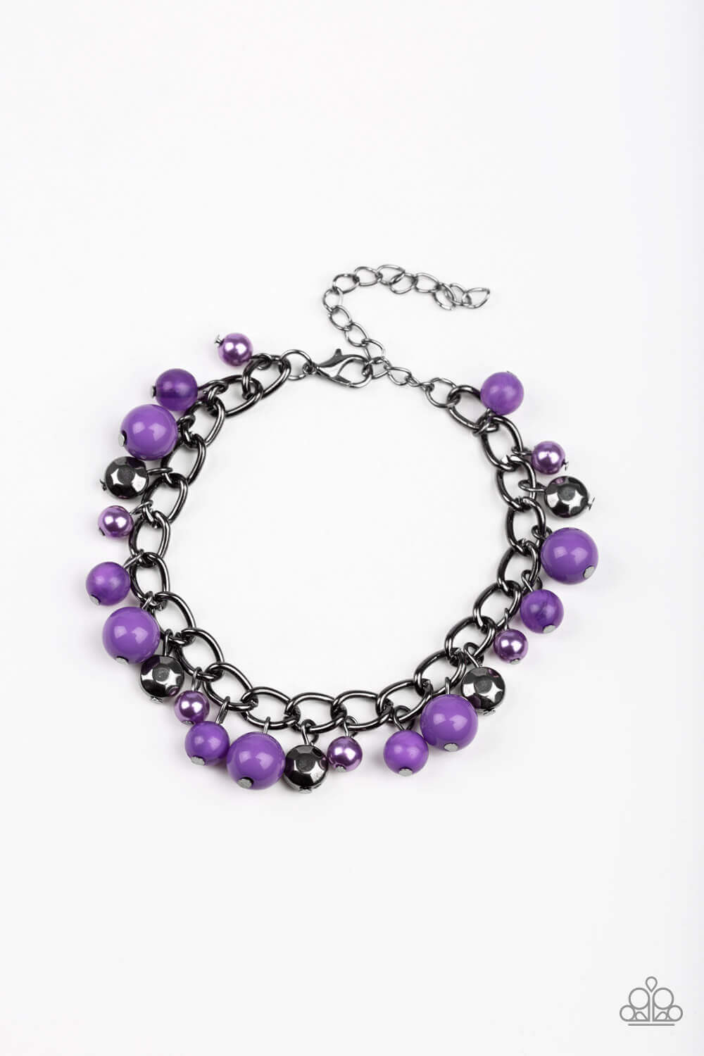 Bracelet: Pearly and polished purple beading joins faceted gunmetal beads along a bold gunmetal chain, creating a sassy fringe around the wrist. Features an adjustable clasp closure.