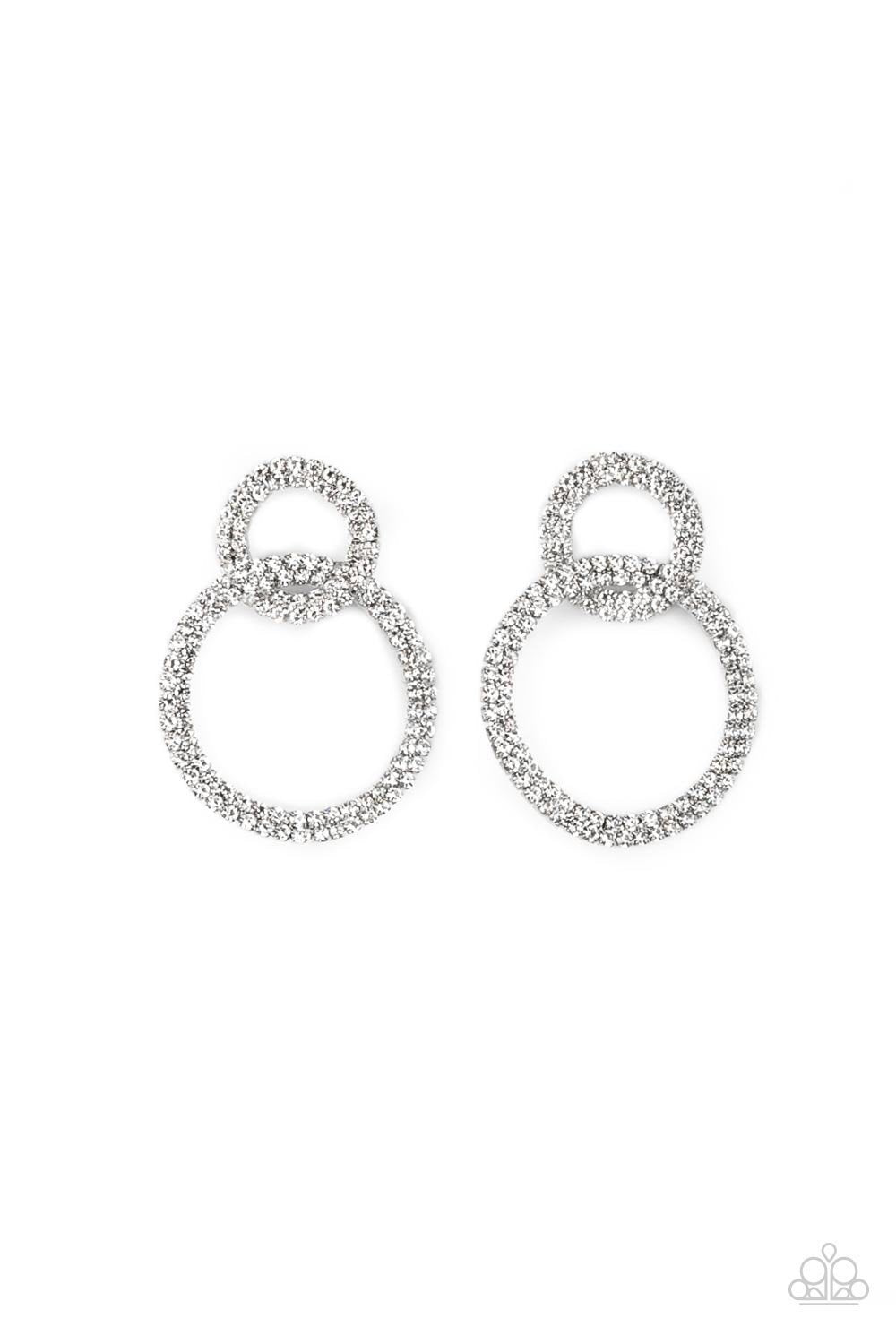 Rows of sparkly white rhinestones encircle into two interconnected hoops, creating a jaw-dropping lure. Earring attaches to a standard post fitting.