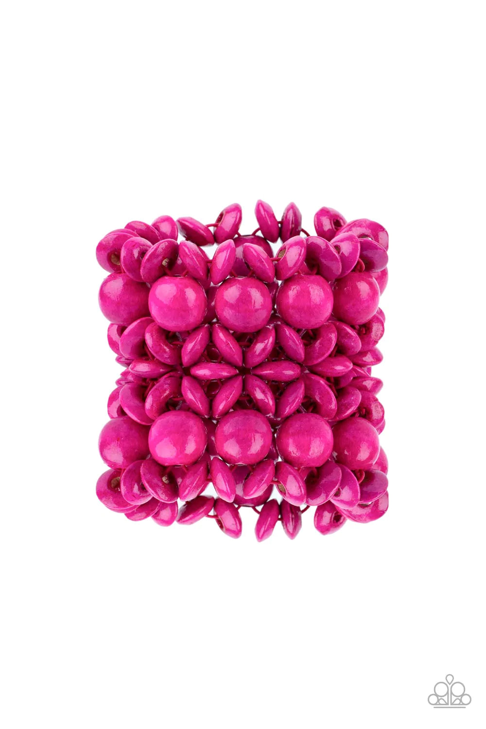 Brushed in a vibrant pink finish, an oversized collection of disc shaped and round wooden beads are threaded along ornately knotted woven stretchy bands around the wrist for a tropical inspired fashion.