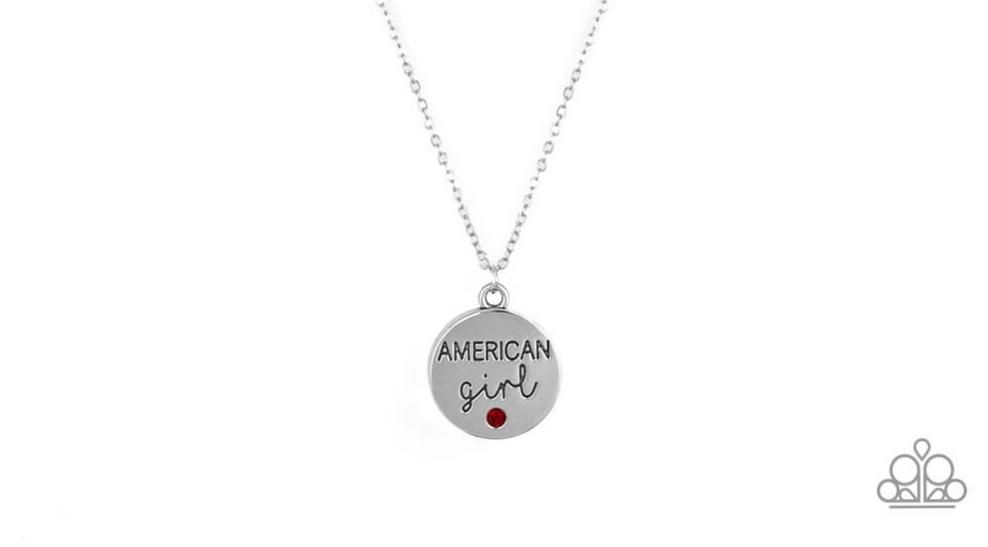 Dotted with a dainty red rhinestone, a shimmery disc is stamped in the phrase, "American girl", for a whimsical look below the collar. Features an adjustable clasp closure.