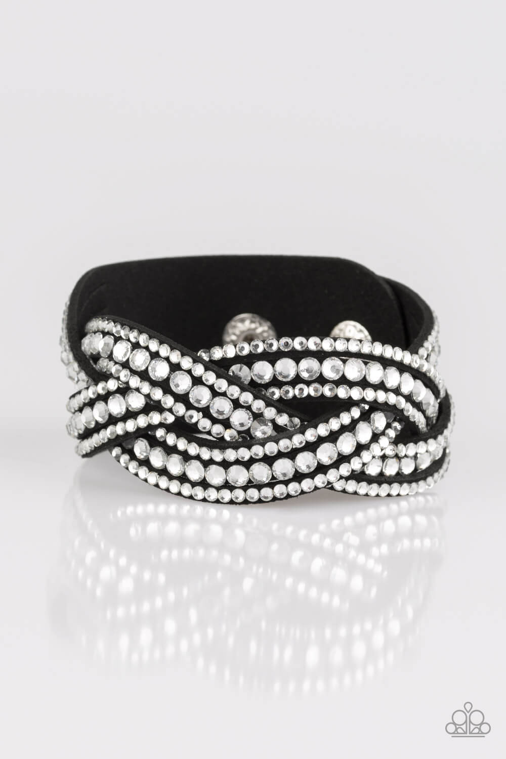 Varying in size, glassy white rhinestones are encrusted along interwoven black suede bands, creating blinding shimmer across the wrist. Features an adjustable snap closure.