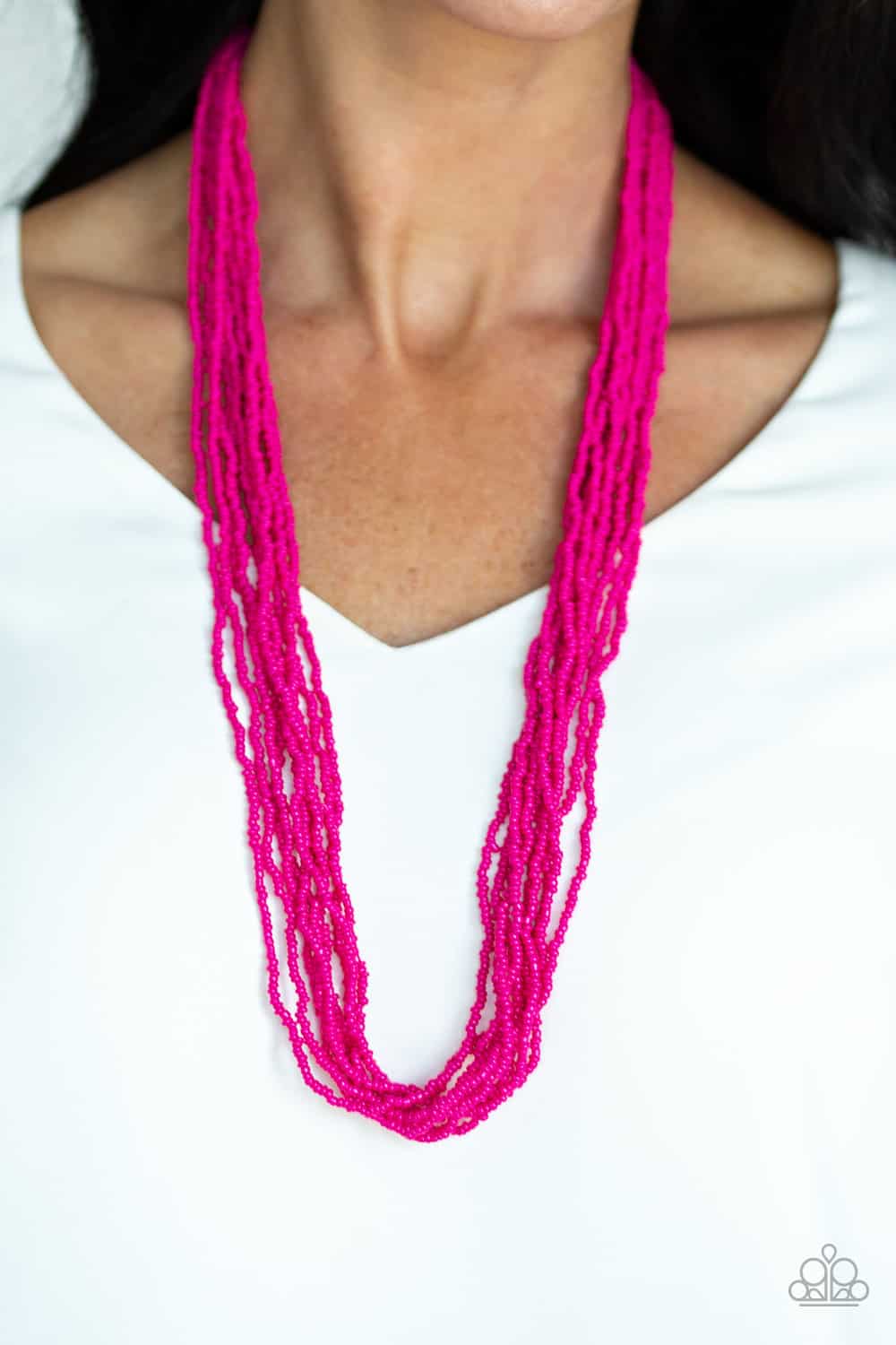 Suspended between two silver fittings, strands of countless pink seed beads layer across the chest for a vivacious look. Features an adjustable clasp closure.