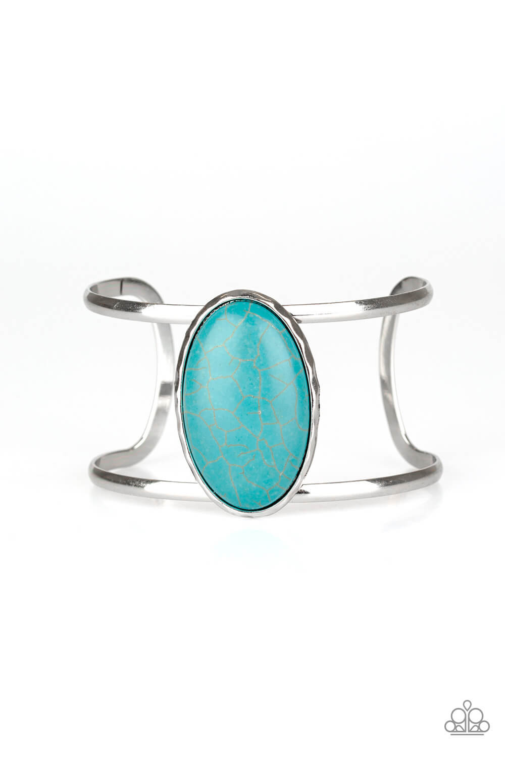 Chiseled into a tranquil oval, an oversized turquoise stone is pressed into the center of an airy silver cuff for a seasonal look.