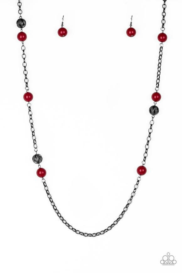 Rich red beads and ornate gunmetal beads trickle along a bold gunmetal chain, creating a colorfully industrial look across the chest. Features an adjustable clasp closure.