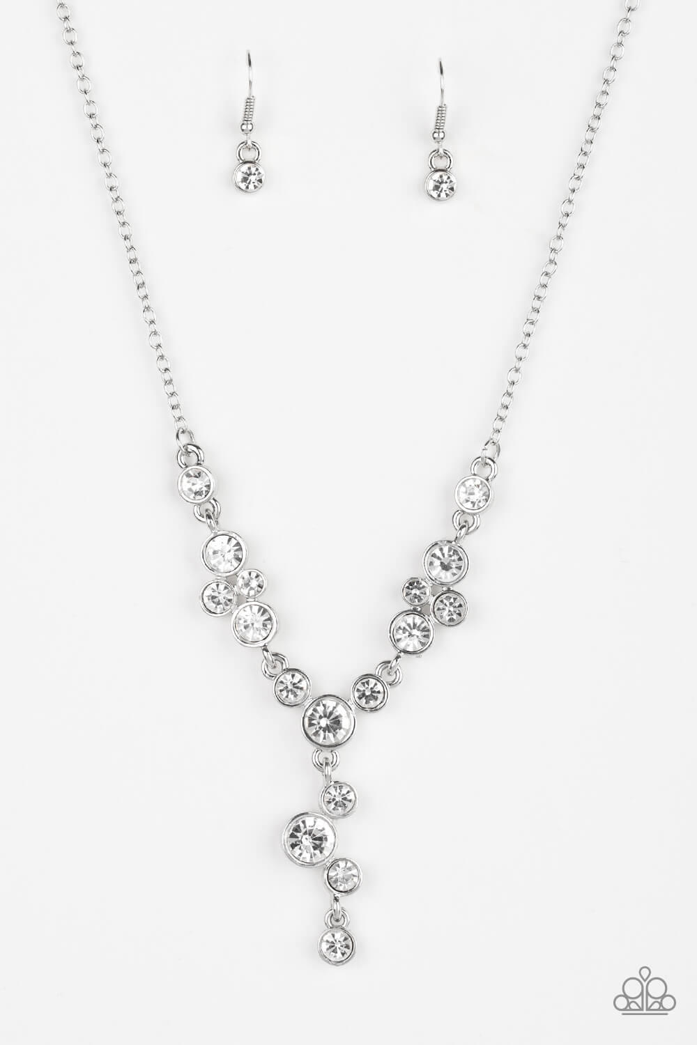 Encased in sleek silver frames, a collection of glittery white rhinestones coalesce into dazzling frames below the collar. Matching rhinestones trickle from the center, creating a glamorous extended pendant. Features an adjustable clasp closure.