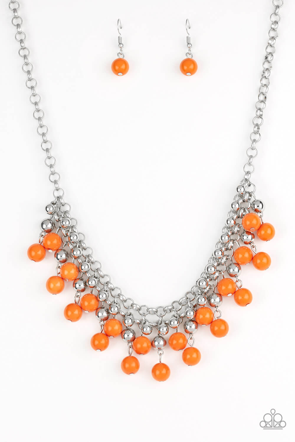 Rows of classic silver and vivacious orange beads trickle from two rows of interlocking silver chains, creating a bold colorful fringe below the collar. Features and adjustable clasp closure.