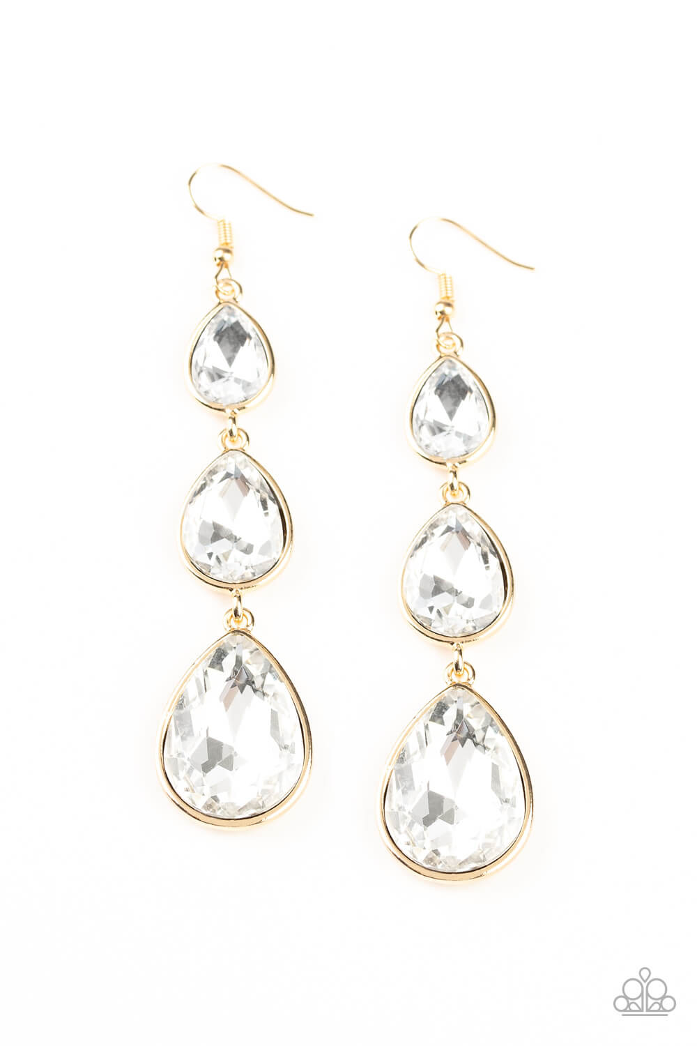 Featuring sleek gold frames, exaggerated white teardrop rhinestones gradually increase in size as they drip from the ear. Earring attaches to a standard fishhook fitting.