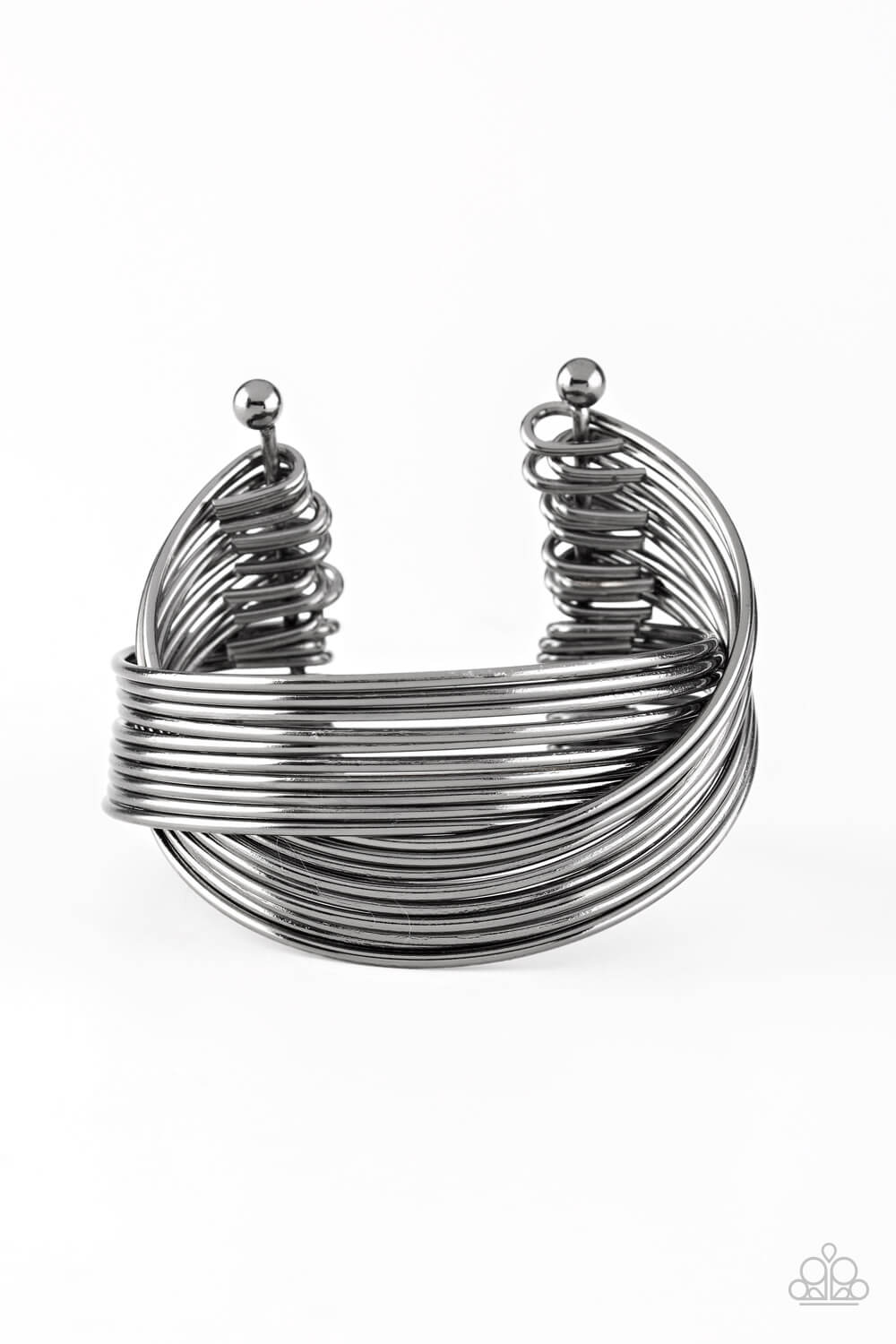 Threaded along two metallic rods, glistening gunmetal bars crisscross across the wrist, coalescing into a layered cuff.