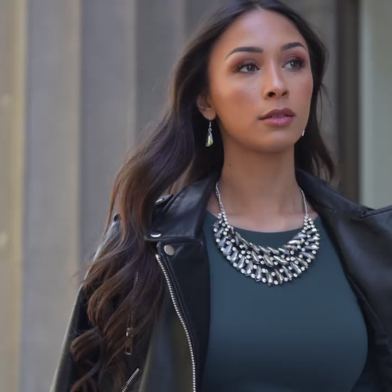 Smoky, triangular rhinestones are scattered along the collar in razor-sharp precision, falling into a dramatic, angular pattern. Brilliant white rhinestones are sprinkled in between the faceted, smoldering gems, adding fearless hints of sparkle to this glamorously gritty jaw-dropper. Features an adjustable clasp closure.