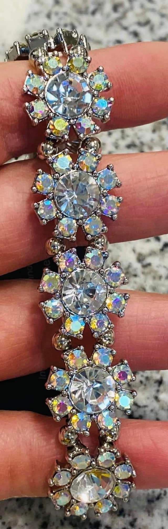 Separated by pairs of dainty silver beads, iridescent rhinestone dotted petals bloom from oversized white rhinestone centers along stretchy bands around the wrist for a flirtatious floral fashion. Due to its prismatic palette, color may vary.