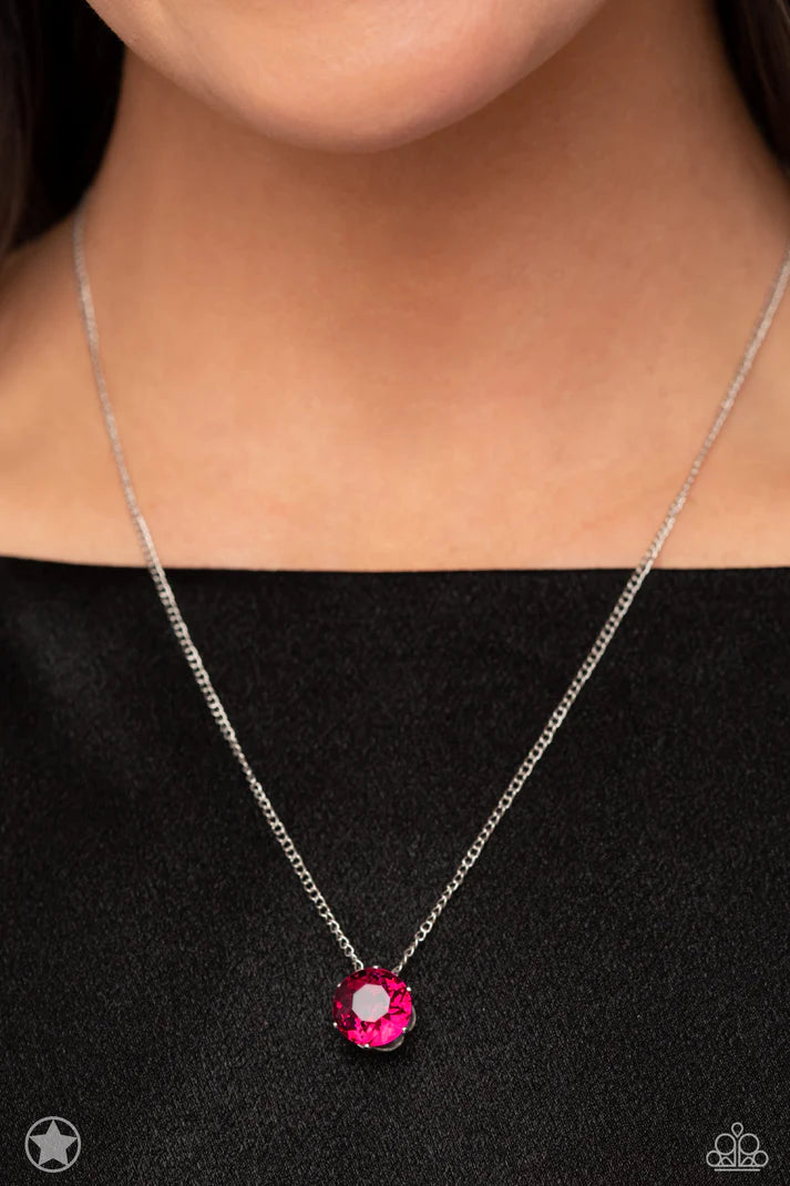 A single fuchsia rhinestone sparkles brilliantly at the bottom of a dainty silver chain, creating a stunning solitaire design. Features an adjustable clasp closure.